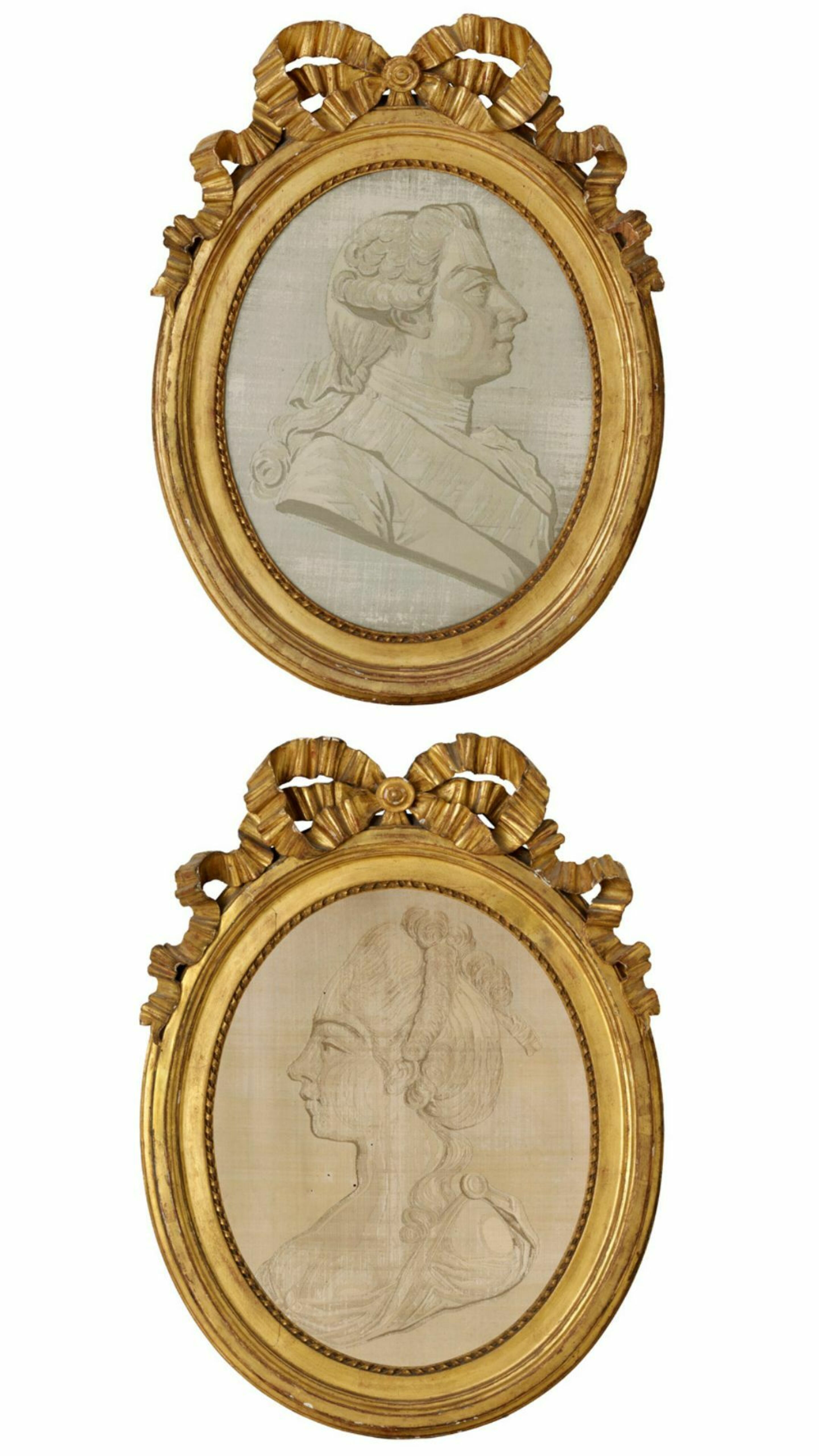 Les portraits en camaïeux des époux s’inscrivent chacun dans un médaillon. Ils se font face, dans un parfait profil rappelant les camées ou encore les médailles à l’effigie des Rois de Rome dans l’antiquité et des Princes de la Renaissance. Contrairement au portrait tissé de Catherine II de Russie, ceux-ci n’ont pas été rapportés de broderies de fleurs, mais les cadres dorés dans lequel ils ont été montés sont décorés en leur sommet d’un nœud sculpté, iconographie très répandue au XVIIIe siècle.