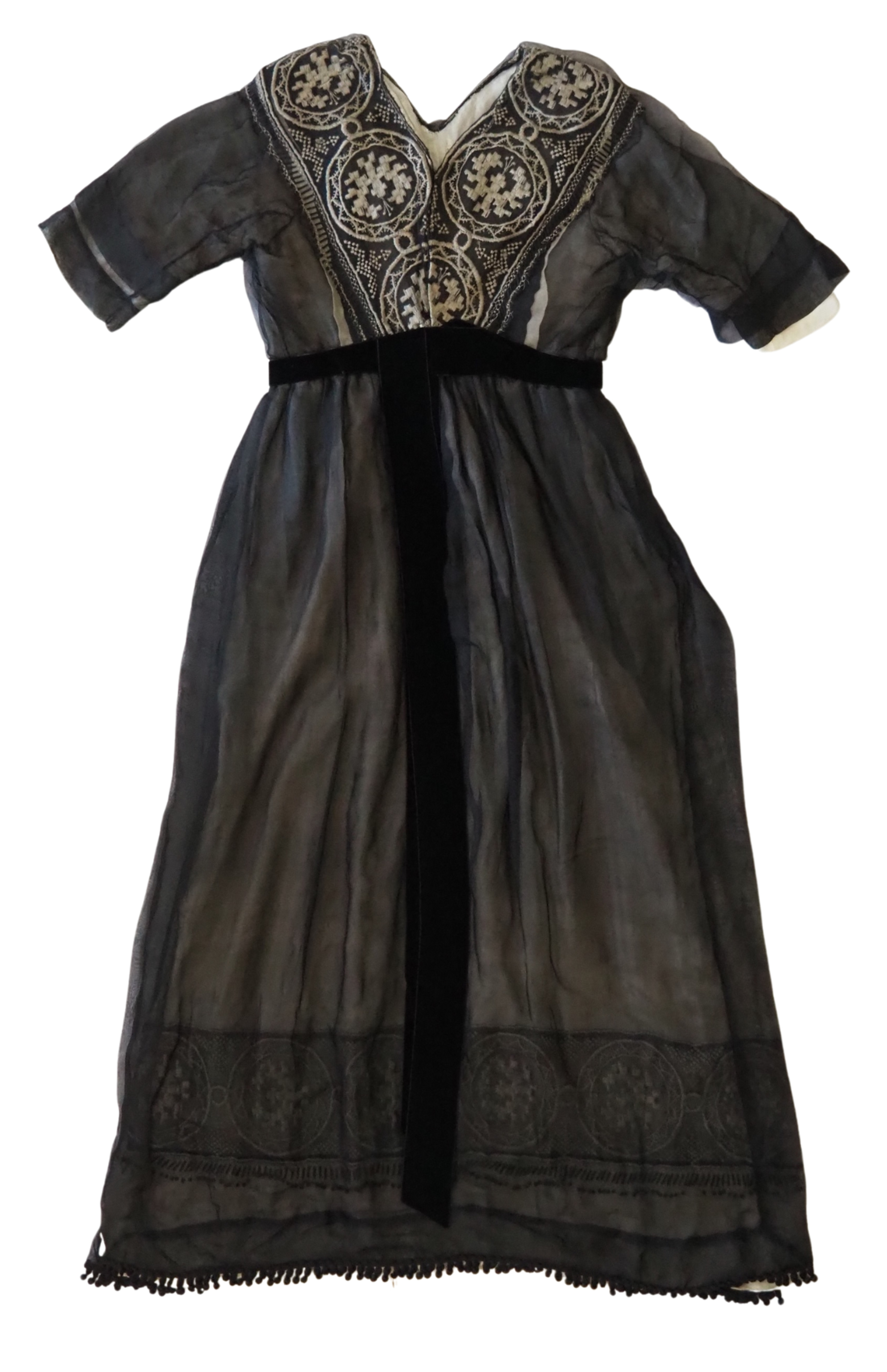 Jusqu’à la Grande Guerre, les trois périodes du deuil établies au XIXe siècle sont encore respectées, permettant ainsi de dater ce modèle vers 1910. Pendant la période de demi-deuil, il est admis de porter des vêtements combinant le noir, le blanc, le gris et le violet, au lieu du seul noir. Cette robe vaporeuse à la coupe droite en mousseline et taffetas de soie, est soulignée à la taille par un ruban de soie et à son encolure par du tulle brodé. La sous-robe, en soie chargée, est terminée par une frange de boules satinées et une rangée de pierres.