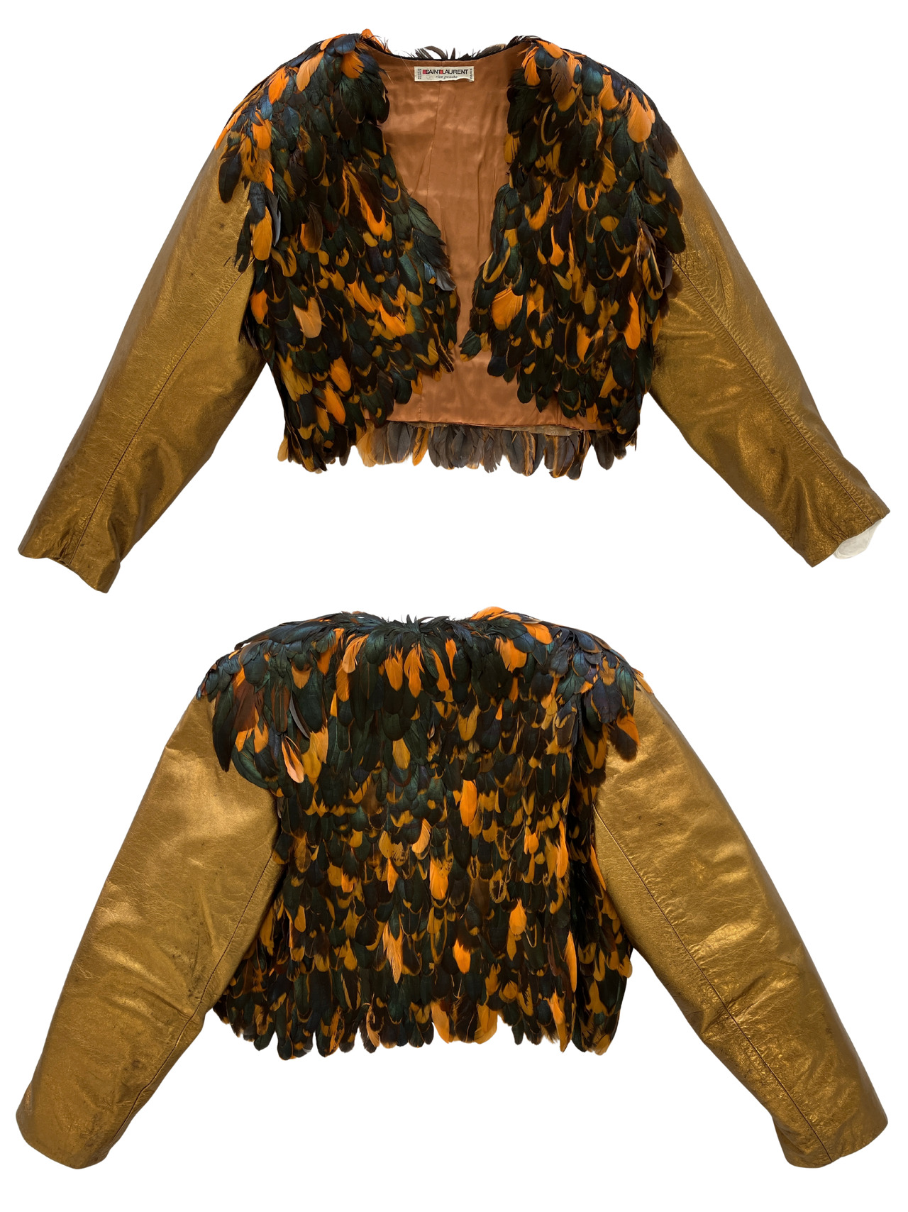 À la croisée de la mode et de la matière, ce boléro Saint Laurent Rive Gauche illustre le lien entre haute couture et savoir-faire textile. Sa forme, inspirée du boléro traditionnel, prend toute son allure grâce aux plumes de coq mordorées et du cuir métallisé, pour inscrire cette pièce dans une longue histoire de création textile.