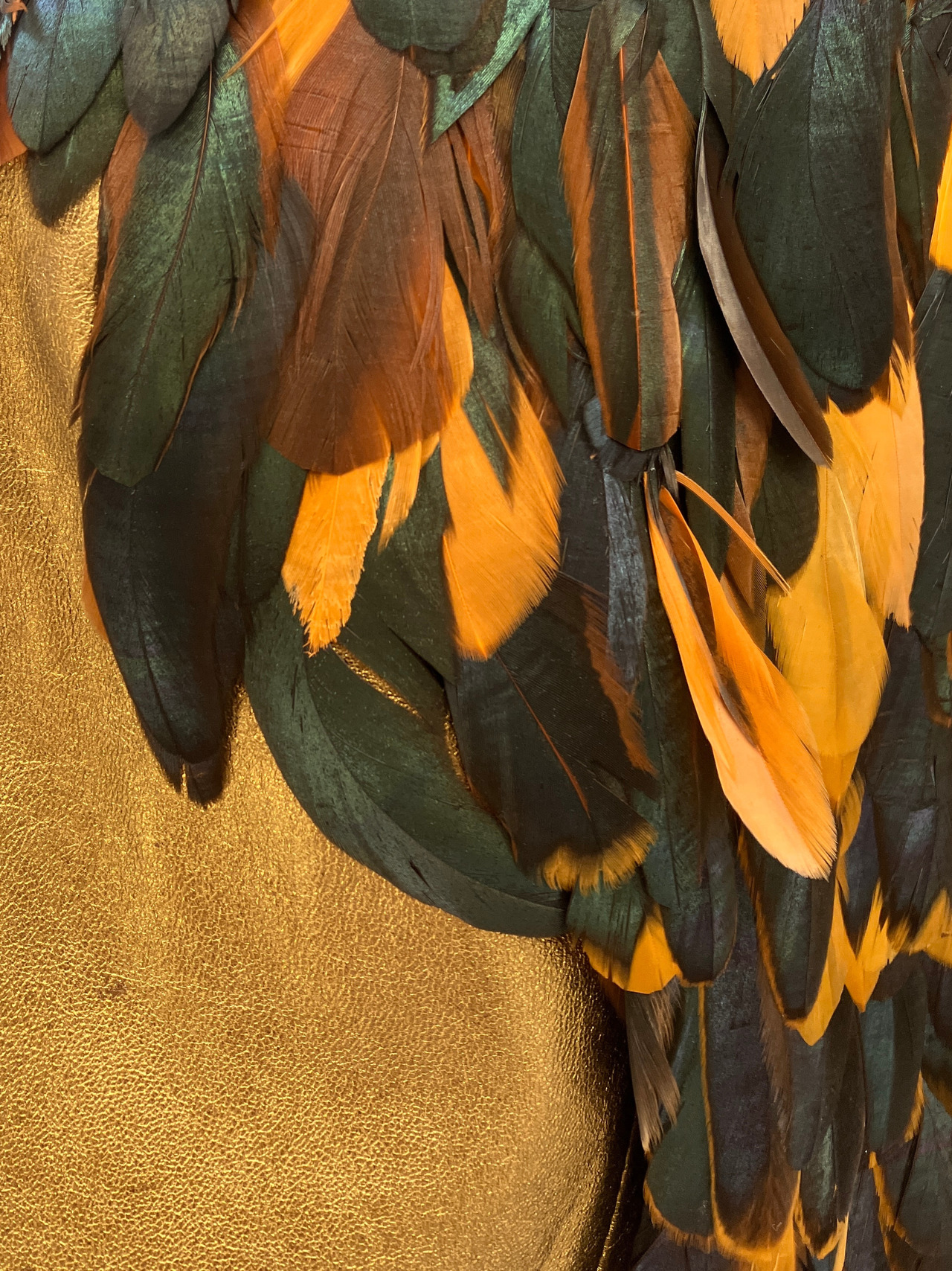 Le corps de veste se compose de plumes de coq mordorées et teintées en orange vif, fixées sur des bandes d’organza de soie, puis cousues à la main sur un taffetas rappelant la doublure. Les manches, en cuir d’agneau métallisé couleur vieil or, apportent souplesse et contraste à l’ensemble.