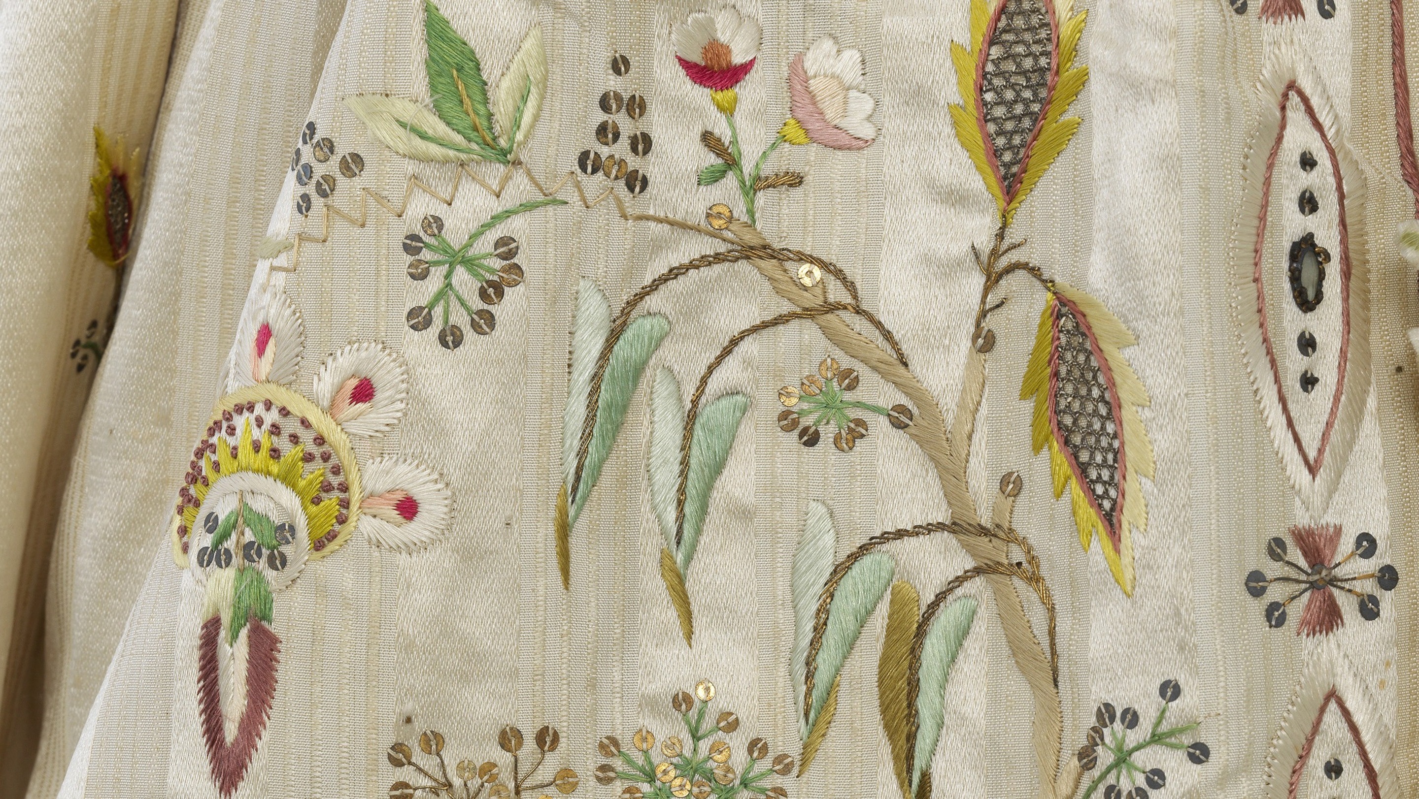 Les fleurs brodées dans le style de Pillement, selon la technique de la peinture à l’aiguille, ornent le bas du jupon et les côtés de la jupe, les grandes compositions fleuries sont complétées d’un simple semis. Les bordures en falbalas sont réalisées dans une gaze de soie plissée, garnie de fleurs obtenues par des applications de soie peinte.