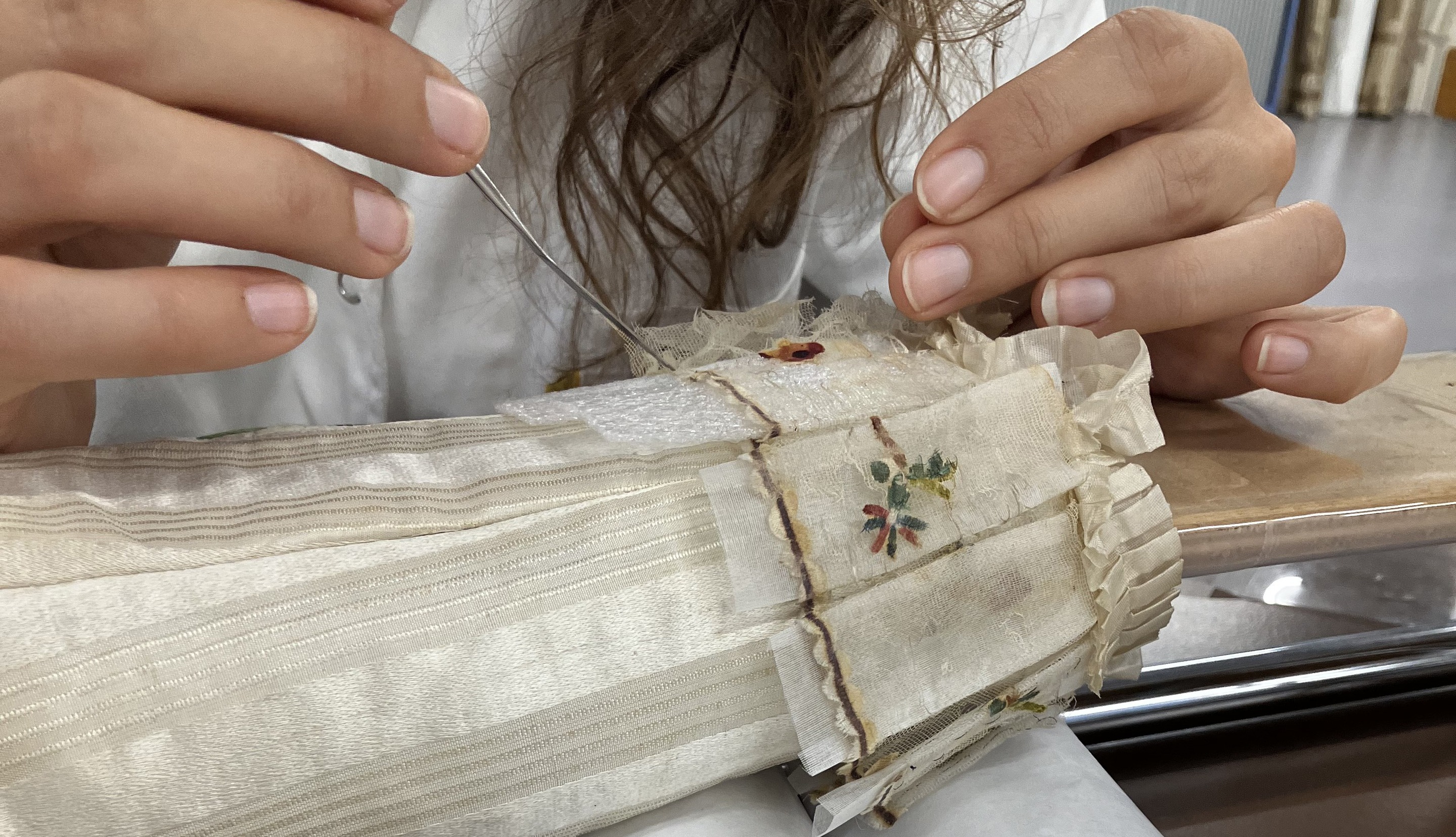 Enfin, les plis marqués sont remis à plat, les coutures ouvertes sont fermées et les fils soulevés ou libres sont maintenus par des points droits ou de restauration, réalisé manuellement, toujours avec un fil d’organsin.