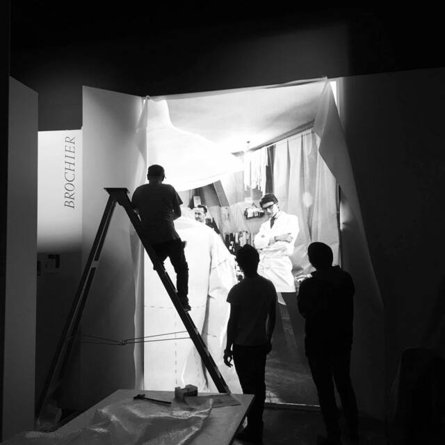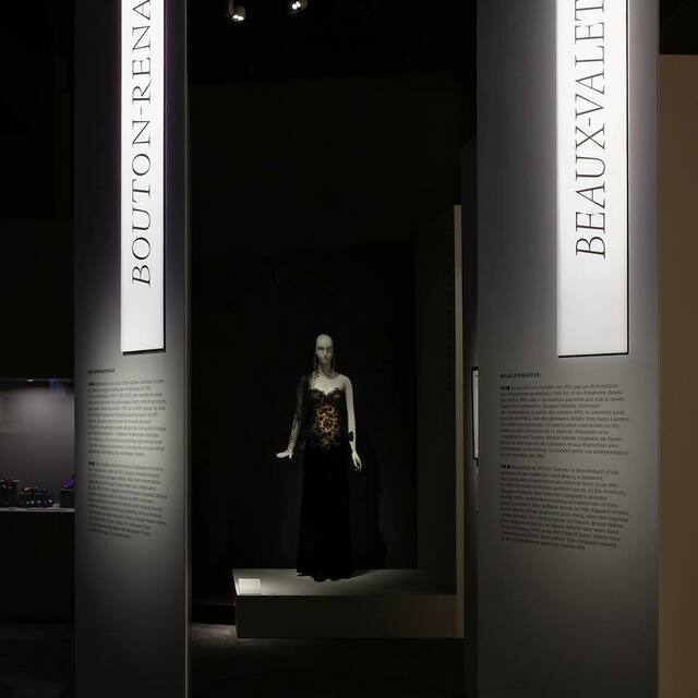Une robe de mousseline et un manteau trois-quarts en moire invitent les visiteurs à approcher et comprendre les différentes étapes de la réalisation d’une pièce de haute couture. Ces créations sont accompagnées de croquis et autres documents de travail, bons de commande, publicités d’époques ou photographies de défilés.