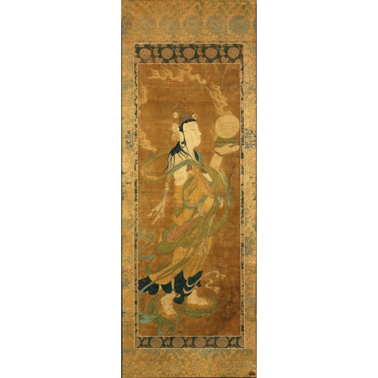 Appartenant à la série dite "la danse du lion", ce kakemono représente la déesse de la lune, Gwatten, debout sur une fleur de lotus, portant le disque de la lune décoré d'un lapin blanc. Cette divinité est à opposer au dieu du soleil, portant le disque du soleil rouge décoré d'un coq.