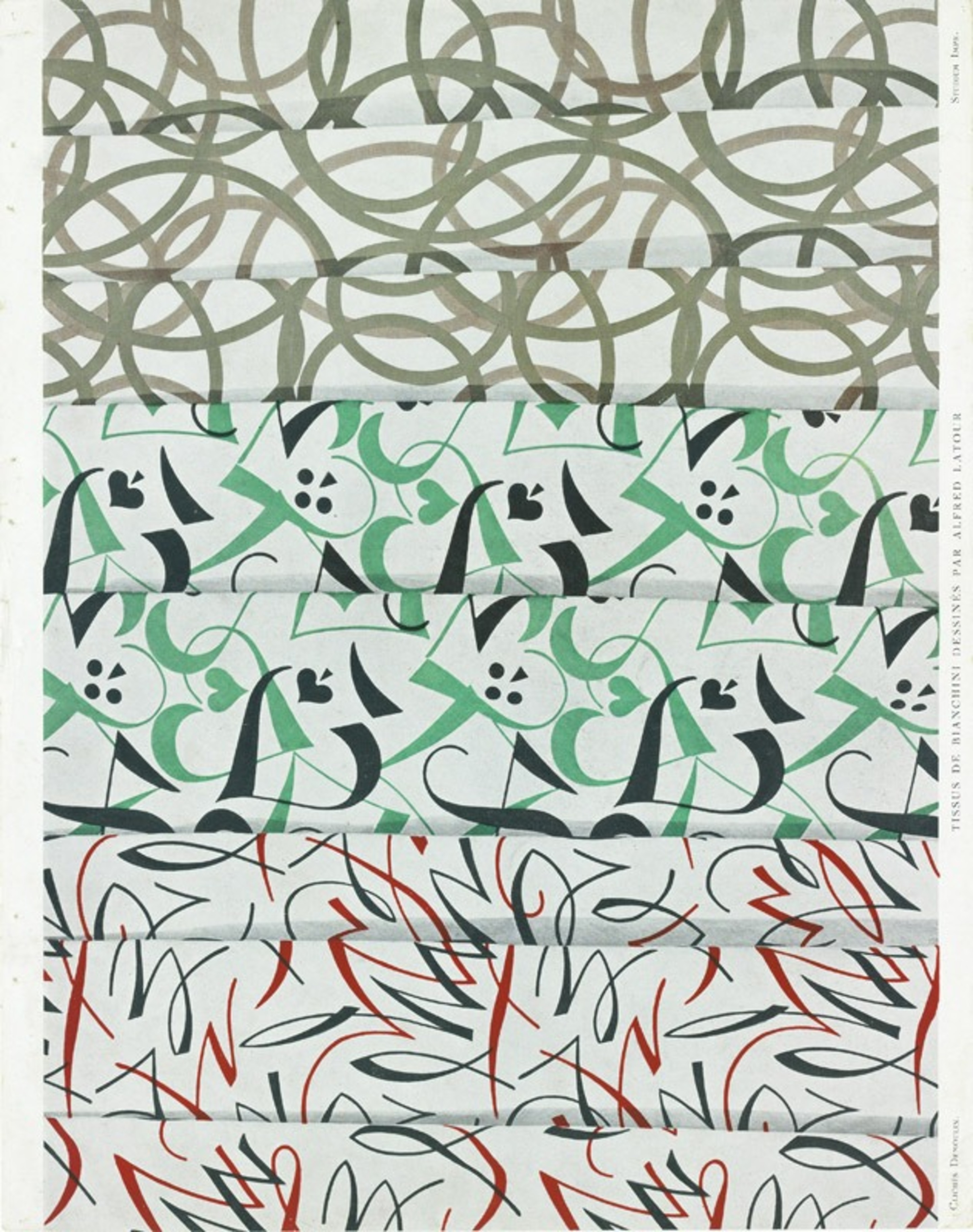 D’albums d’esquisses et de tissus réalisés pour le compte de la maison Bianchini Férier dès 1929, révélant ainsi, ce lien caractéristique de l’époque, qui unissait les artistes et l’industrie textile.