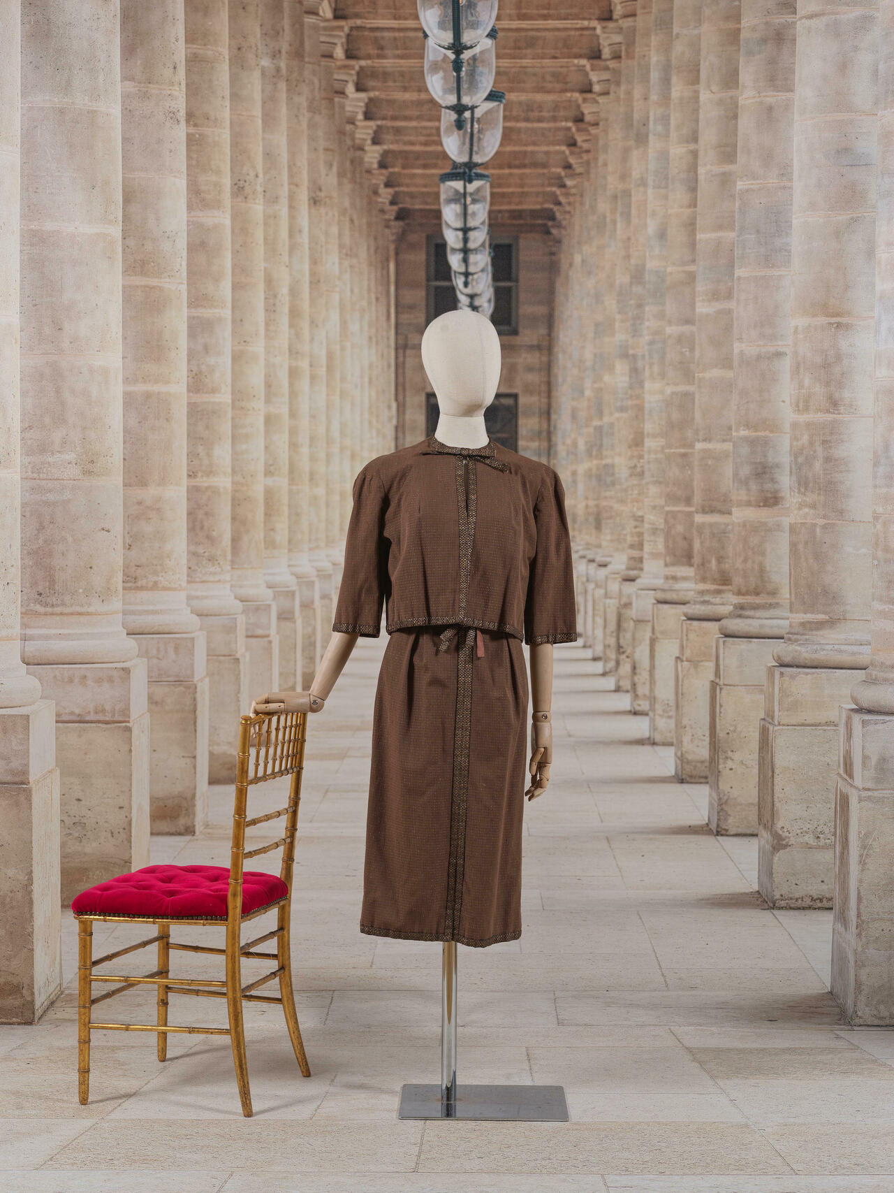La robe et sa veste, coupées dans une toile de lin marron glacé façonnée de fils lurex dorés et ornées de ruban d’or, captent la lumière et révèlent le savoir-faire artisanal de la créatrice.