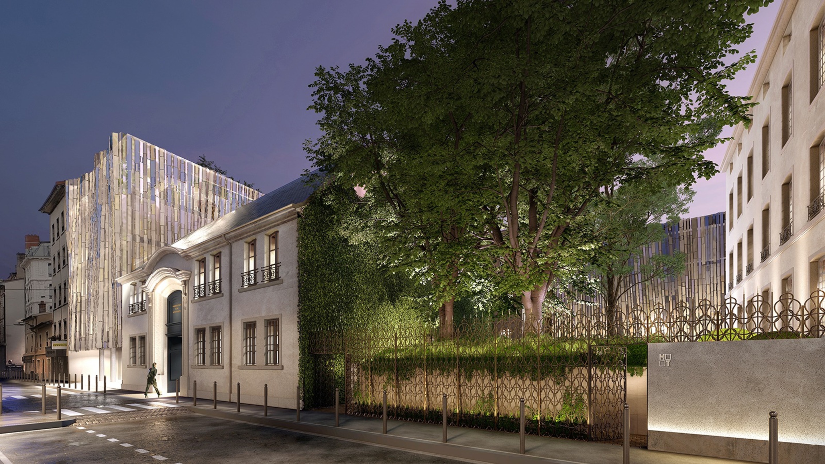 Les façades des deux nouvelles constructions, l’hôtel des Tissus, visible de la rue de la charité, et l’hôtel Neuf, lieu de connexion entre les deux hôtels particuliers, seront recouverts d’un drapé en lamelles de verres.