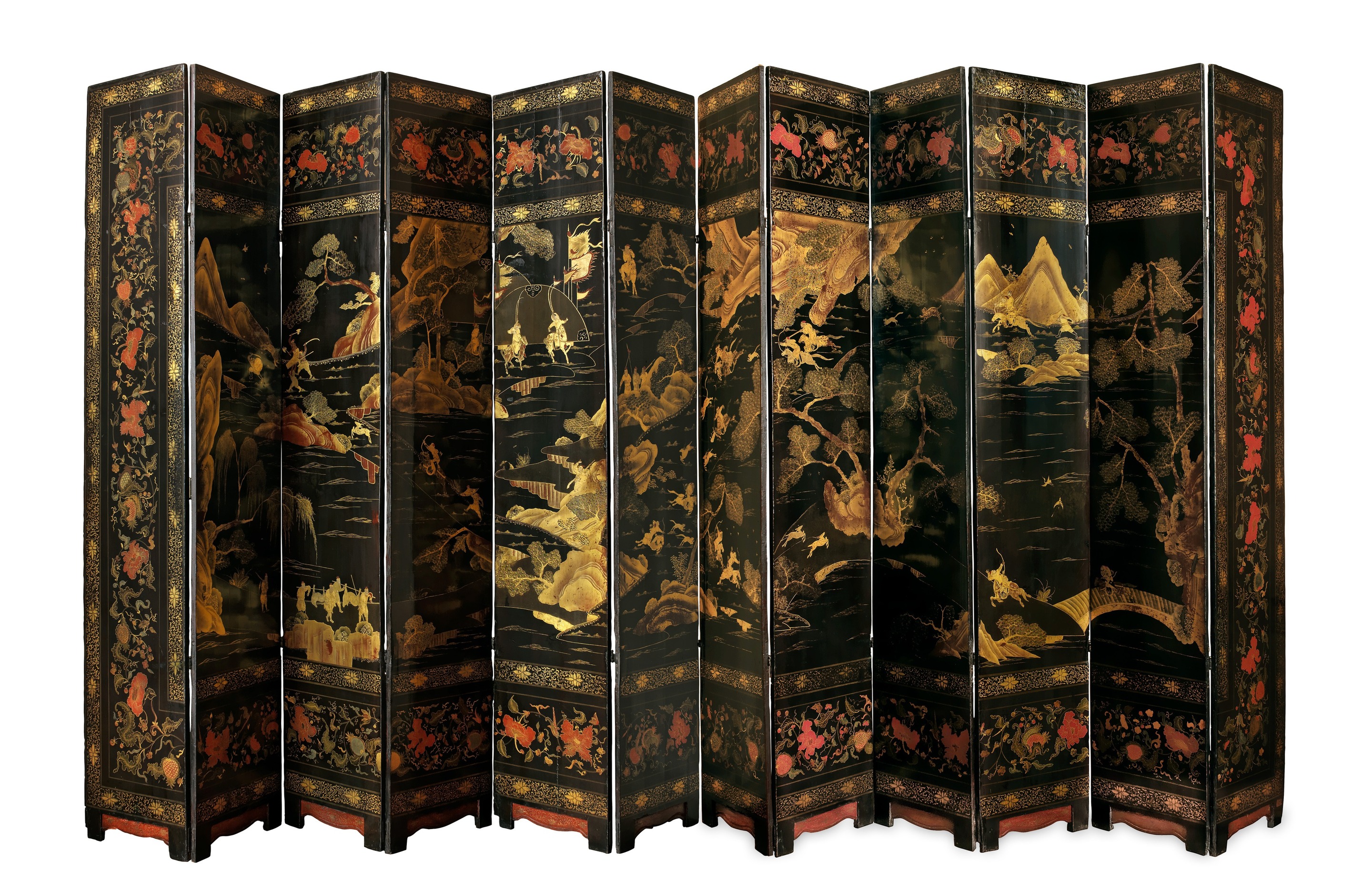 PARAVENT À DOUZE FEUILLES À DÉCOR DE SCÈNES DE CHASSE DANS UN PAYSAGE