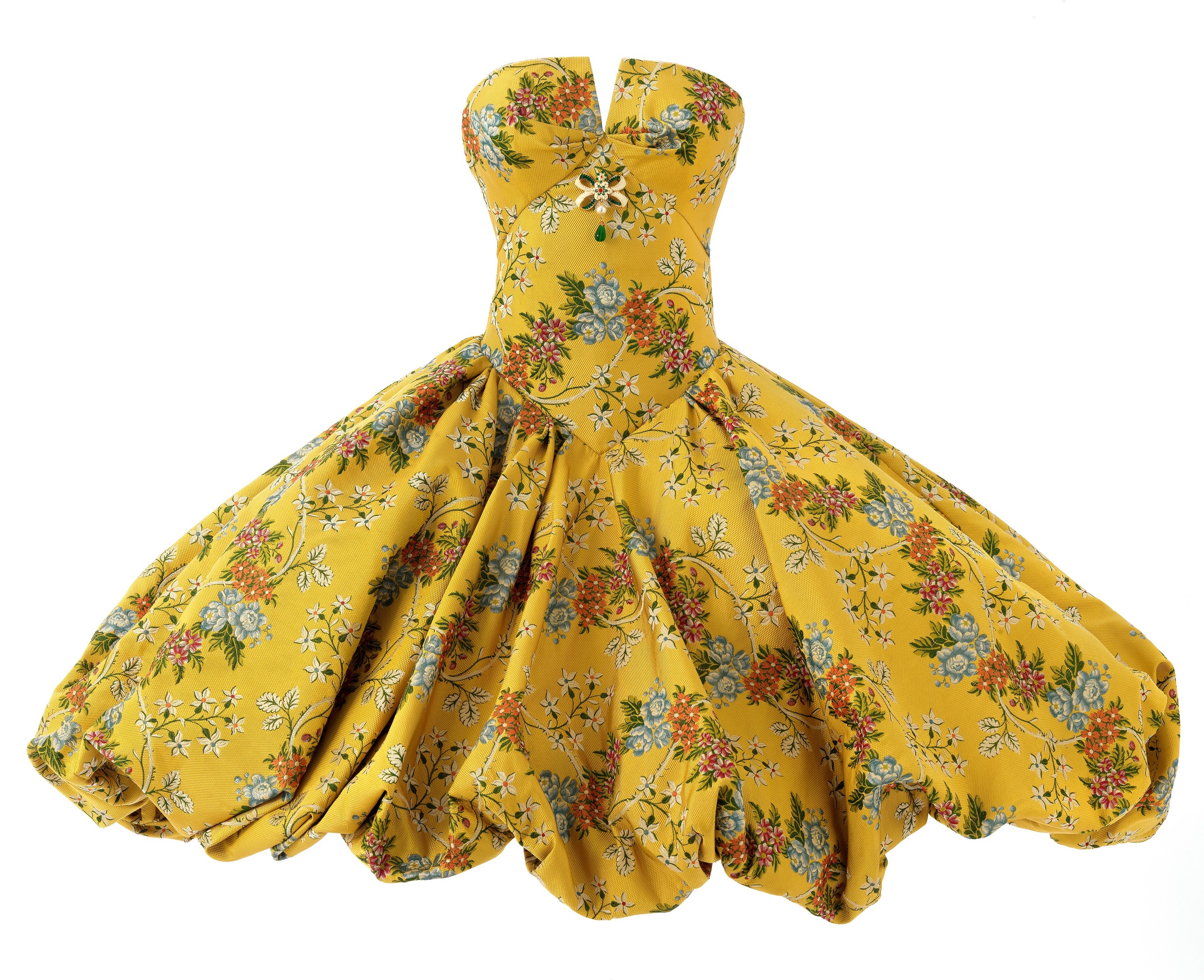 Pour cette robe de cocktail, la maison de couture Carven a eu recours à un tissu d’ameublement : un riche lampas à fond cannetillé, produit par la maison Tassinari et Chatel, une réédition d’une étoffe d’époque Louis XV, en coloris or.