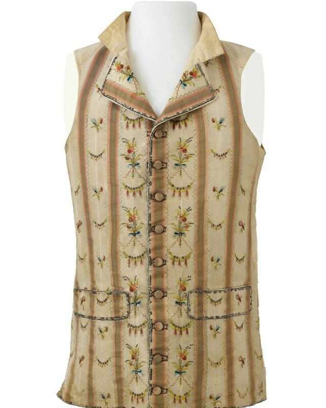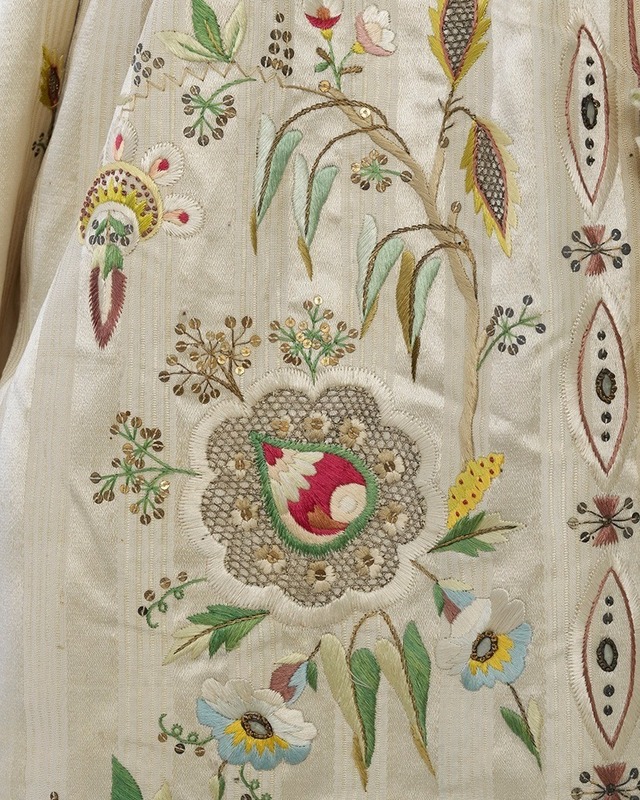 La soierie d’ameublement, par son décor et sa tenue, s’adapte parfaitement aux références historiques auxquelles le styliste a fait appel pour cette silhouette destinée à illuminer le défilé.
