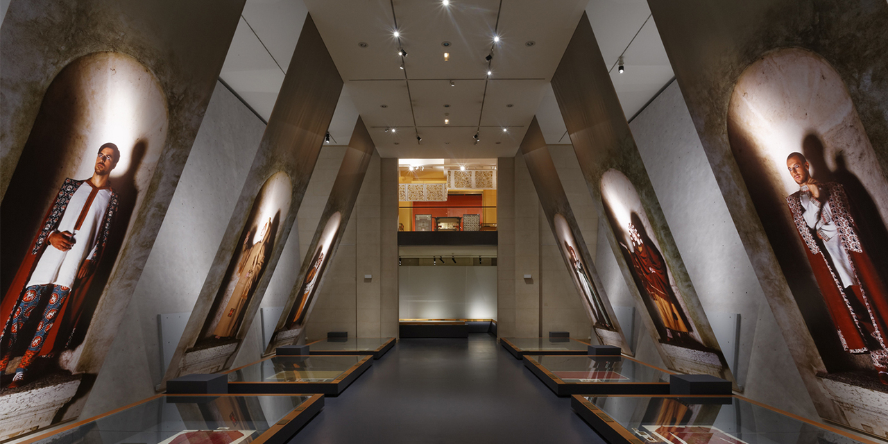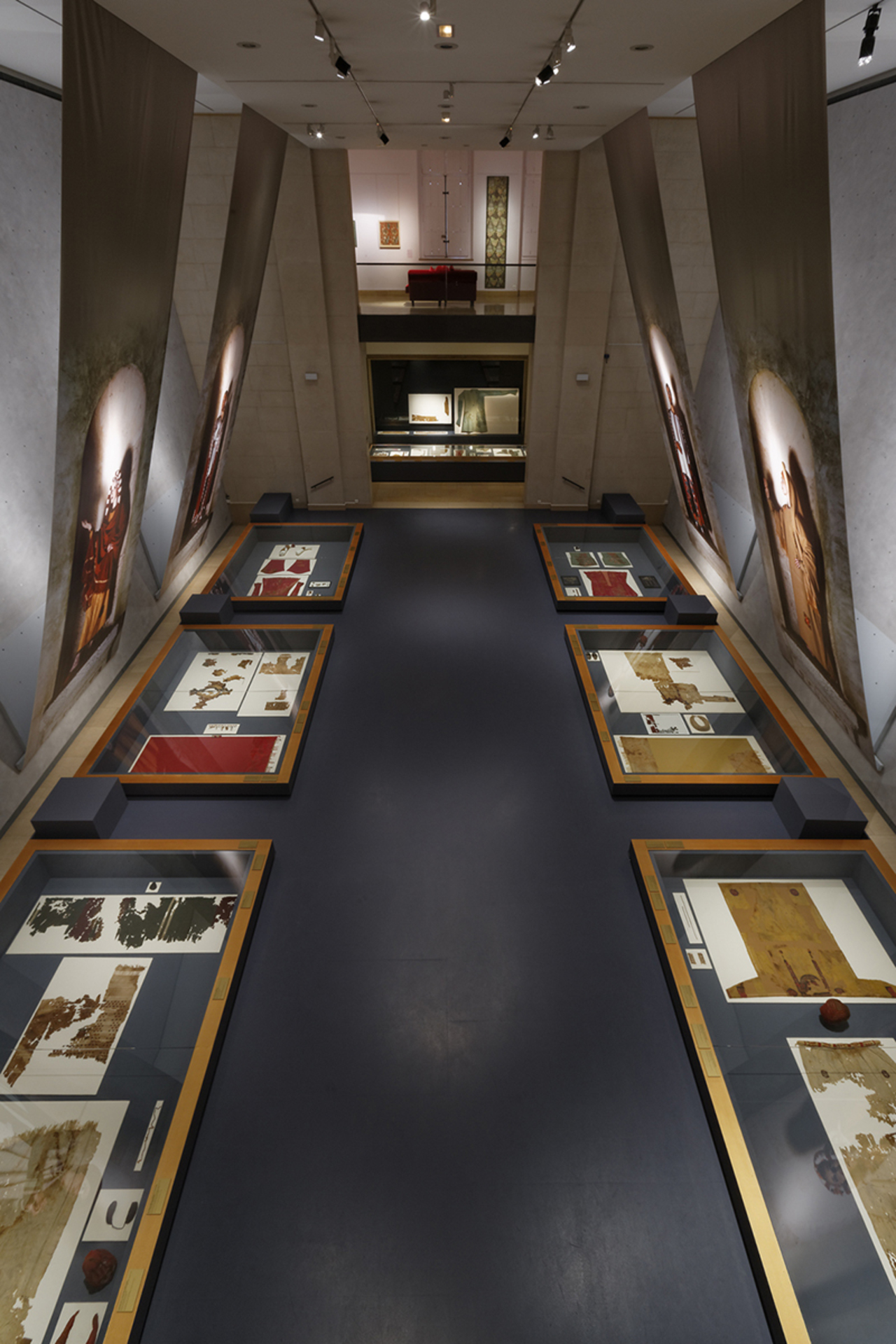 Près de deux-cent cinquante œuvres (dont soixante-dix prêts du musée du Louvre) sont présentées dans l’exposition (costumes complets, accessoires de coiffure, chaussures, fragments, tentures, coussins funéraires, corps vêtus, datant majoritairement des IVe - VIIIe siècles, aquarelles contemporaines des fouilles et photographies de Cédric Roulliat). Le Palais des Beaux-Arts de Lille et le musée des Confluences de Lyon ont également accepté de prêter les momies costumées d’un « conducteur de char » qui officiait à l’hippodrome, d’un « fonctionnaire à la pourpre », très probablement attaché à l’administration du palais, et d’un « chevalier byzantin », portant le costume caractéristique de son rang.