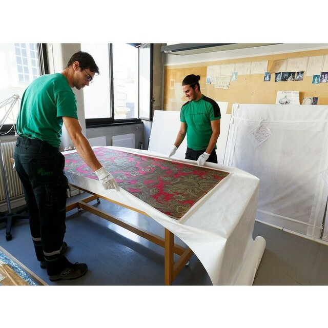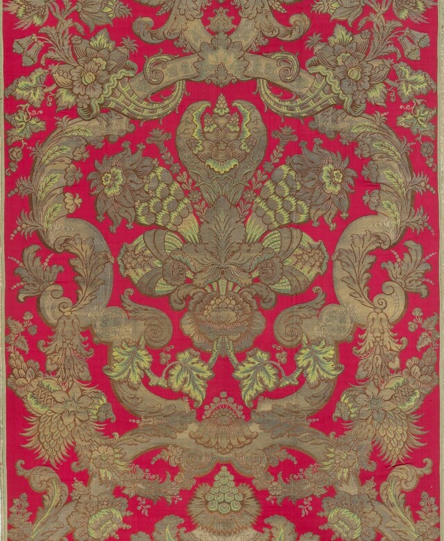 Pour cette exposition, le musée des Tissus a prêté une œuvre exceptionnelle, la Tenture Brocart de meuble à fond cramoisi, commandé pour le service du roi et employé dans la Grande Chambre à coucher du roi à Versailles.