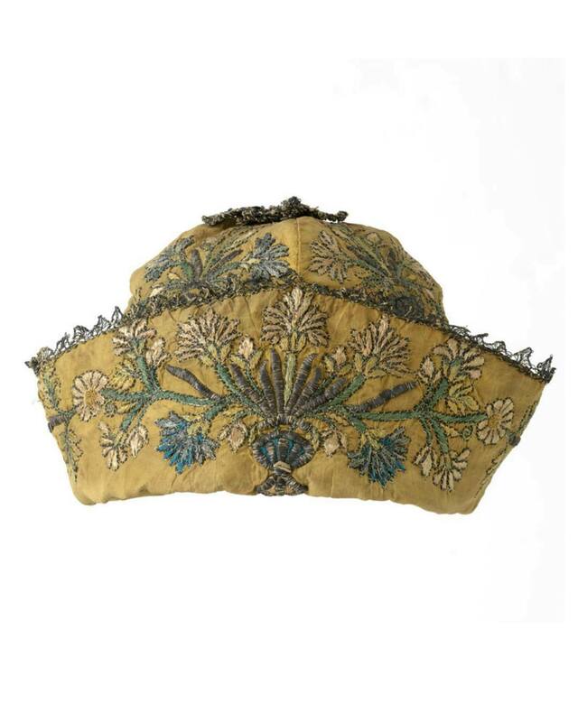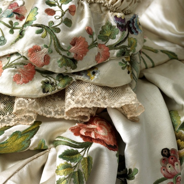 Sous le règne de Louis XV, l’Angleterre influence la mode masculine et féminine française. Apparue en France dans les années 1770, la robe dite à l’anglaise, se caractérise par sa simplicité, composée d’un corsage fermé sur le devant avec une pointe dans le dos et d’une jupe. L’anglomanie vestimentaire libère du panier, au profit d’une silhouette plus naturelle, comme en témoigne le modèle du musée, confectionné dans un satin écru brodé de fleurs au point passé et galonné de passementerie en soie.