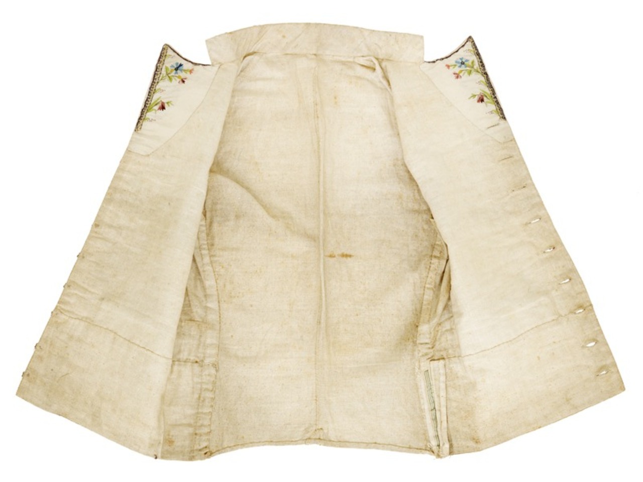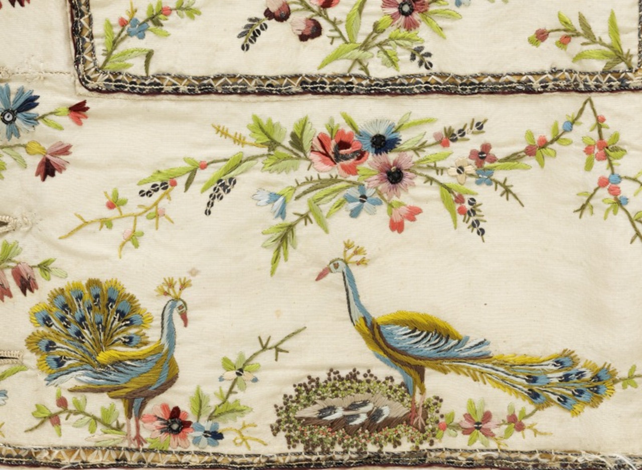 Vers la fin du XVIIIe siècle, le gilet est précieusement décoré sur la partie visible ; revers de col, les poches et les boutonnières. Comme ce modèle brodé d’un décor de semis de fleurettes et de paons sur le bas, rehaussé de paillettes et de strass serti de cannetille métallique argent. Un soin tout particulier est apporté dans le décor des boutons, recouvert ici, de filé argenté. Le devant est généralement confectionné dans une étoffe luxueuse, ici un taffetas, alors que la doublure et le dos, sont dans une toile plus ordinaire, ici de lin et de coton.